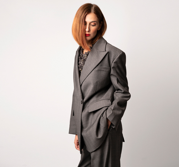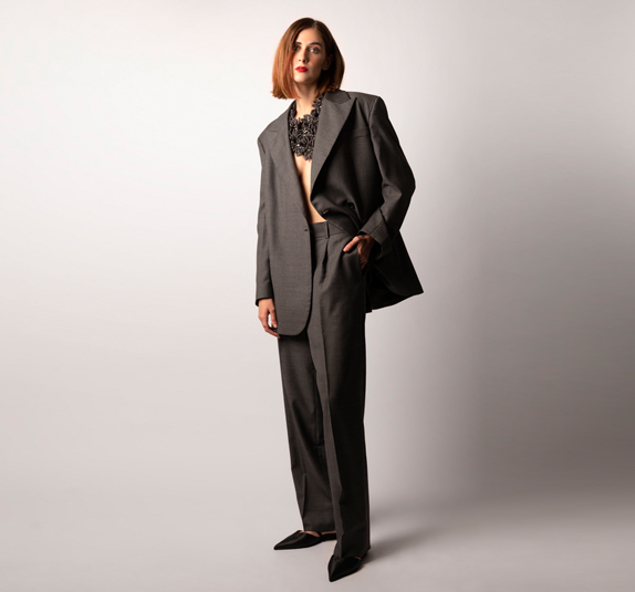 The Tailleur is the counterpart of the men’s suit and, in the 1980s, symbolized the professional rampantism of career women. The first was made in 1885 by English tailor John Redfern for the Princess of Wales, taking up the styles of the so-called German hongreline. The suit made by Redfern was no-frills, paired with masculine accessories (such as a vest and tie), but was anything but comfortable. Despite this, it symbolizes one of the first steps toward women’s emancipation. In the late 1920s Mademoiselle Coco, freed women from unnecessary constraints by making a soft jersey suit, feminine and practical, with a knee-length skirt. In the fashion world, the suit has found much success, especially in ready-to-wear fashion shows. In 1966 Yves Saint Laurent proposed a pantsuit and transformed it into the first women’s tuxedo suit, making it eye-catching and extremely sensual. In the following decades to the present, the pantsuit has paraded on dozens of runways, continually reinventing itself in colors, fabrics and cuts, now rigorous, now provocative, worn like a second skin with nothing underneath, as Armani suggested in 1993. The pantsuit thus discovers its dual soul: on the one hand the confident, convention-defying, masculine and provocative at the same time; on the other hand the fairy-tale allure, romantic and elegant. My pantsuit is in Loro Piana’s 130’s wool fabric, over line and fit; jacket with inside pocket and handmade buttonholes. A timeless garment of women’s fashion.