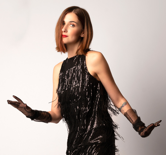 My trapeze dress is made of a wool blend with sequins and lined with silk taffeta fabric, entirely made and finished by hand.