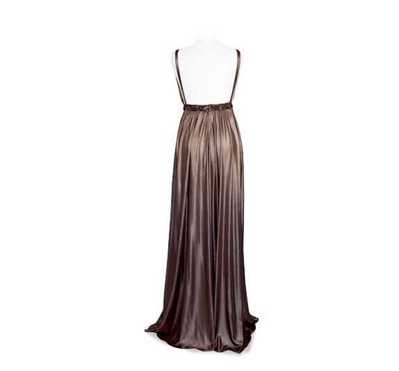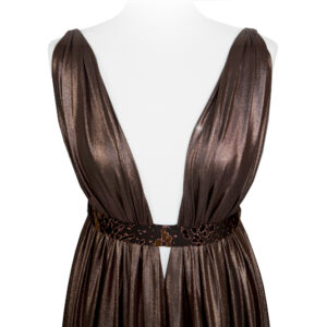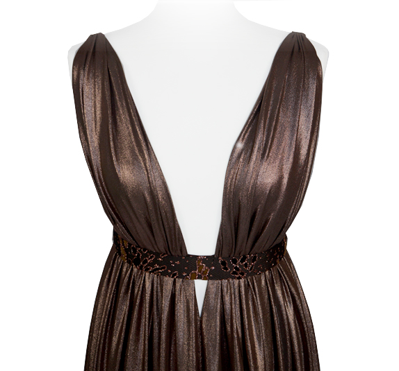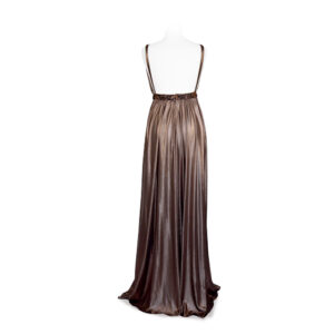 Un inserto a cintura, a vita alta in tinta e ad effetto luccicante, mette in risalto il corpetto fluido scoprendo la schiena.