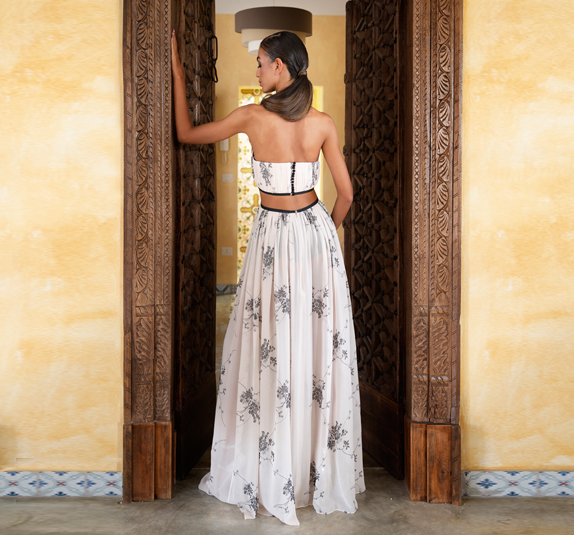 Abito cut-out composto da gonna lunga a volume ampio, con arricciatura e apertura laterale con zip invisibile e corpetto strutturato.