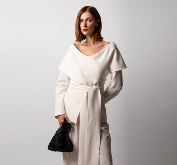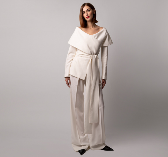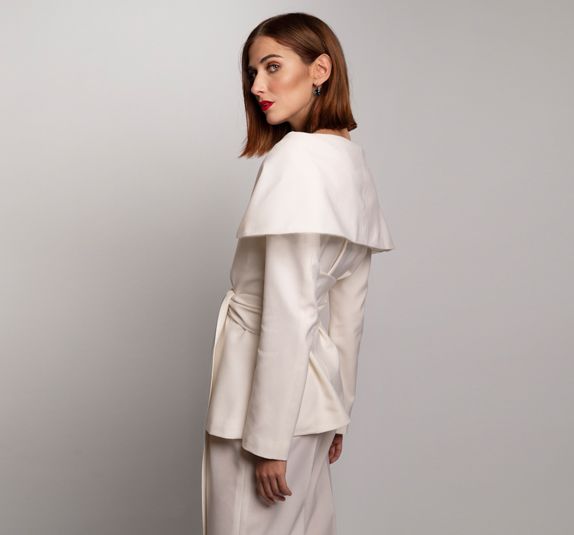Elegante, raffinato e confortevole Blazer bianco in lana con cintura. Blazer con scollo ampio omerale è corredato da una lunga cintura esterna e sovrapposta. Il blazer donna è un capo di abbigliamento che sfida il tempo e le tendenze effimere, così attraente per la sua capacità di trasmettere un senso di stile senza sforzo e di portare con sé un’aura di noncuranza sofisticata.