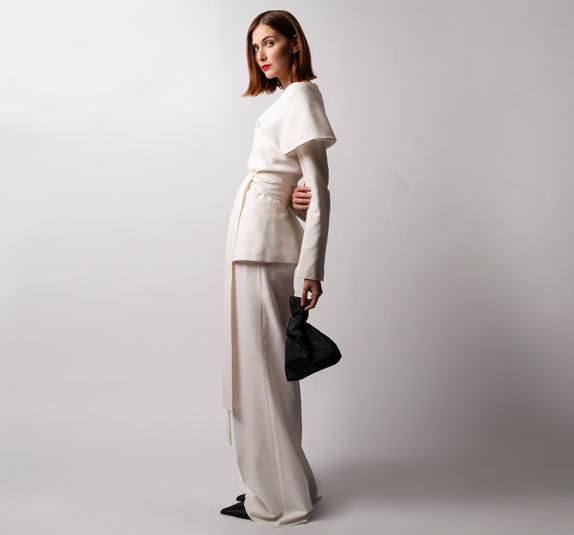 Sobrio ed elegante, questo tailleur in lana vergine purissima fa parte di una mia piccola capsule che ho voluto chiamare “Noir et blanc”, un ‘viaggio’ dal bianco al nero, attraverso le tante sfumature di grigio, per rappresentare il prêt-à-porter realizzato e proposto per la stagione invernale.