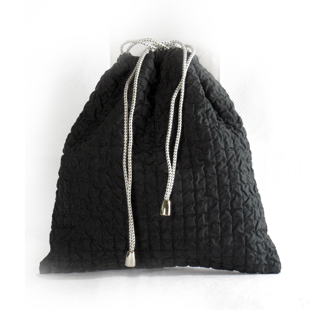 Borsa in tela di cotone impermeabile nera con coulisse e tracolla. Fodera in tessuto nero. Confezionata e rifinita a mano con materiali di prima qualità. Compatta, semplice e raffinata, adatta per un uso quotidiano. La chiusura a coulisse, abbinata alla comoda tracolla, la rende versatile e sicura. L'interno è curato nei minimi dettagli, con una fodera in tessuto nero di alta qualità.
