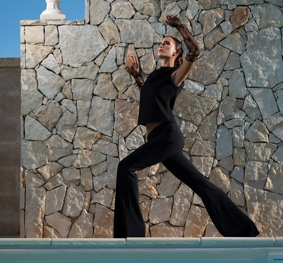 Il modello di gonna a vita alta da me proposto, delicato e raffinato al punto giusto, è in puro cotone nero con prezioso ricamo paillettato di piccole palme e con crop top strutturato abbinato, dello stesso tessuto e colore.