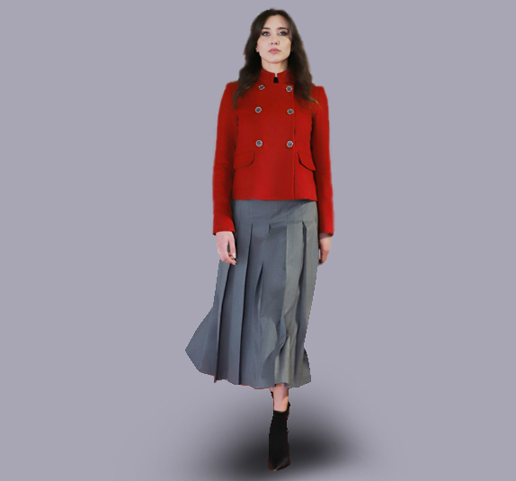 Bottoni rivestiti ed una bellissima sciarpa dello stesso tessuto la rendono unica.