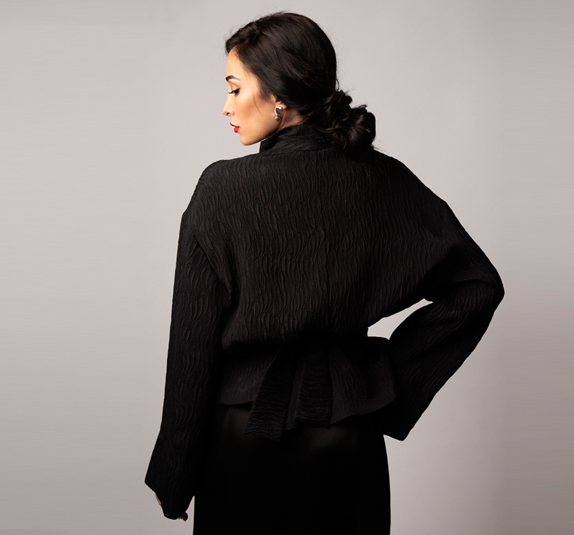 Raffinata ed esclusiva casacca nera in tessuto triacetato, piacevole al contatto sulla pelle e molto confortevole; intelata con tessuto a contrasto. Modello smanicato, linea dritta che accompagna la silhouette del busto. Lunghezza ai fianchi e apertura posteriore con zip invisibile. Da abbinare, preferibilmente, a pantalone o gonna a tubino dello stesso colore. Il capo è stato interamente confezionato e rifinito a mano.