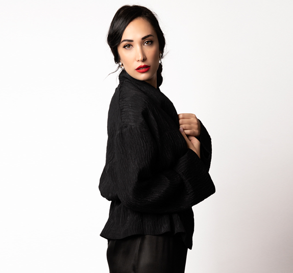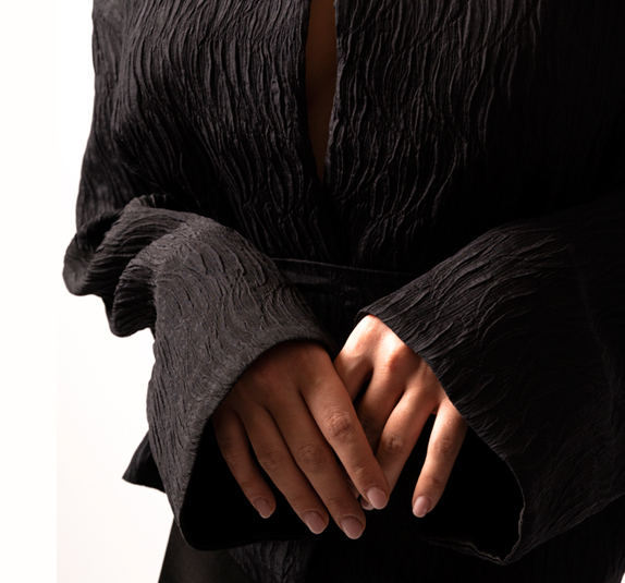 Elegante pantalone sartoriale in crépe cady nero, linea morbida e svasato sotto, altezza media; stile sofisticato e perfetta vestibilità. Si suggerisce di abbinarlo ad una casacca o crop top dello stesso tessuto e colore. L’outfit rende la donna una vera protagonista di una serata. Il capo è stato interamente confezionato e rifinito a mano.
