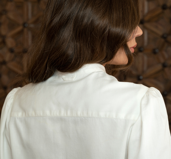La mia camicia bianca in puro cotone alta qualità del Cotonificio Albini, ha vestibilità ampia e comoda, con polsini alti e bottoni in madreperla. Capo confezionato e rifinito interamente a mano