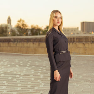La mia minigonna, in pregiato duchesse di seta di colore nero, è caratterizzata da chiusura laterale con zip invisibile e dai passanti per la cintura. E’ abbinata ad una elegante camicia in Jersey di seta, linea dritta elegante e versatile; con abbottonatura a vista. I capi sono stati interamente confezionati e rifiniti a mano.