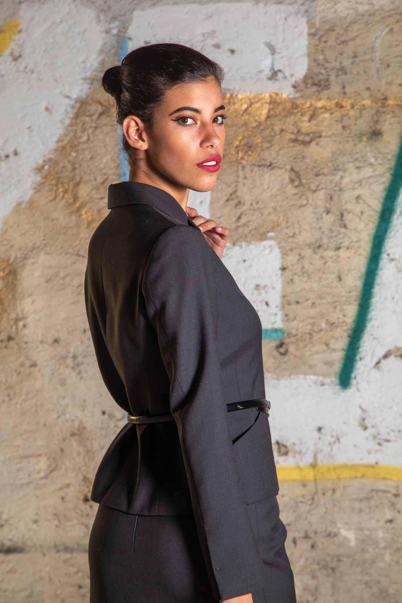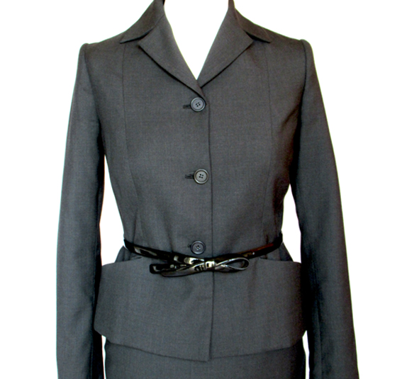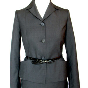 Il tailleur in lana si ispira alla creatività della grande sartoria artigianale francese e italiana degli anni ’50, con giacca stretta sui fianchie gonna a matita.