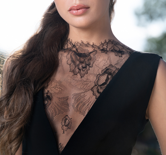 A renderlo più prezioso ed unico, è il pizzo ombra applicato sull’ampia scollatura anteriore.